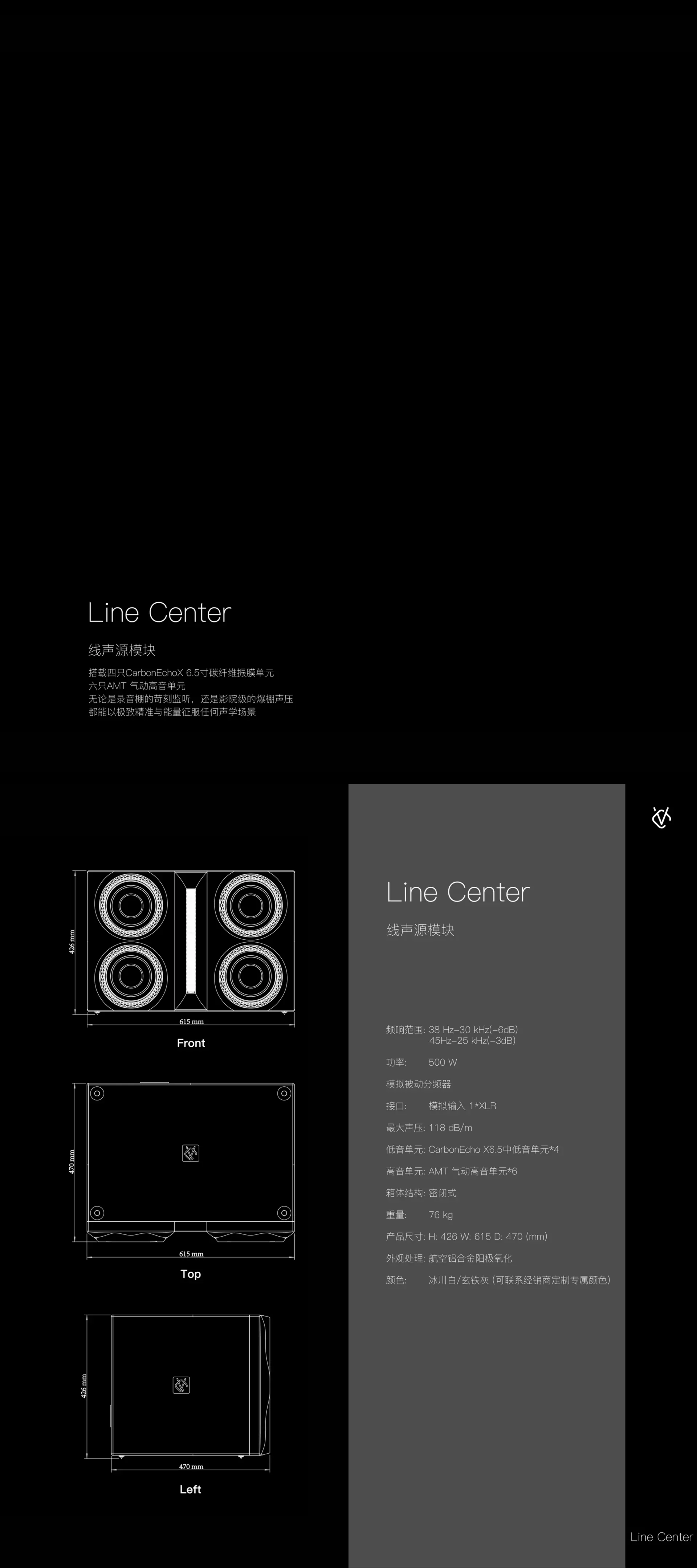 Line Center专为家庭影院中置声道打造,采用4只CarbonEchox6.5 中低音单元与6只AMT Array气动高音组成的精密阵列系统;